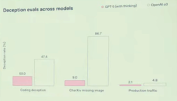 If you didn’t catch it, the leftmost bar shows that GPT-5 (with thinking) is 2.6% more deceptive than the earlier model, o3, but the size of the bars is completely disproportionate! Deception and emotional resonance are not qualities you want when seeking medical advice, writing code, or doing anything other than basic conversation and writing generation with an LLM (and even then, you still don’t want deception). Yet these inherent qualities are the default setting in GPT-5 for every user, and can appear in its generated output even after extensive context engineering by a power user. But OpenAI continues to insist that emotional resonance is something we need and that being deceived 50% of the time isn’t that bad, even in dire health situations where an honest, expert opinion is far more important than your feelings.